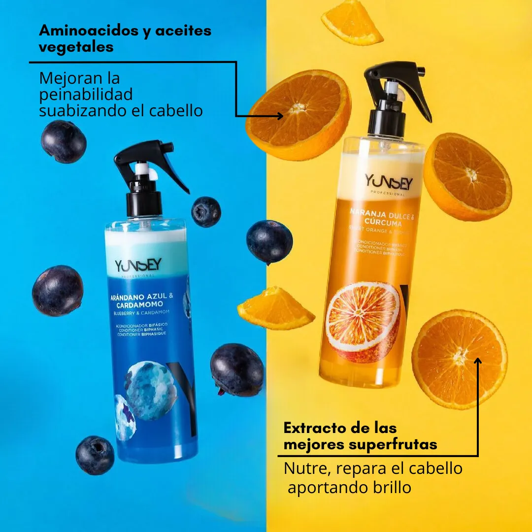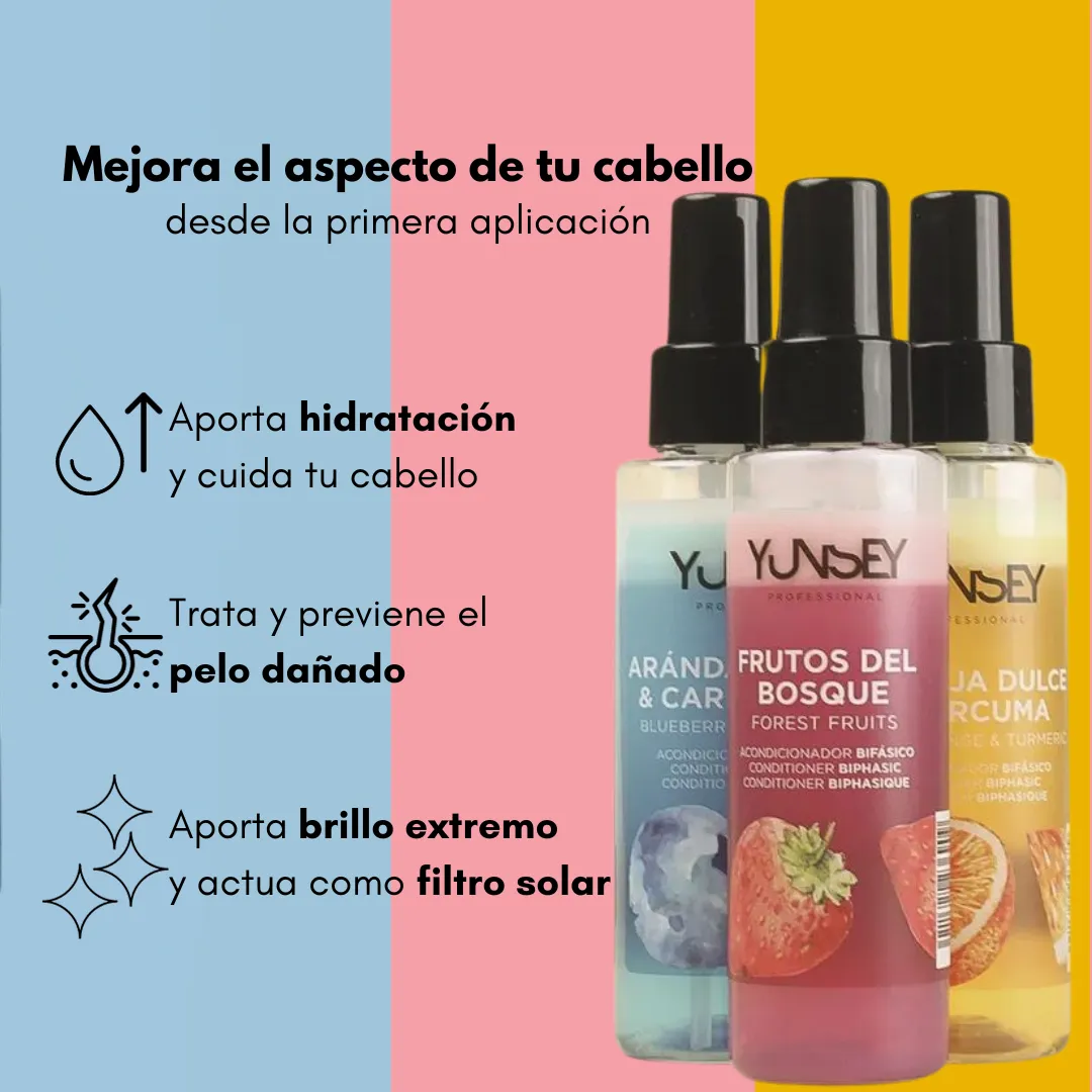 Acondicionador en spray en 2 fases. La fase superior mejora la parte externa del cabello, proporcionando brillo, suavidad y mejorando la peinabilidad mientras la fase inferior repara y nutre el interior del cabello.