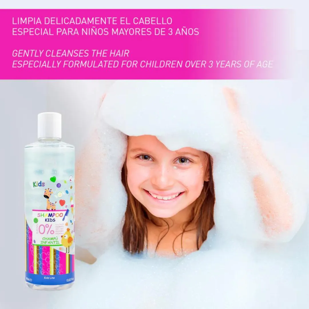 Champú infantil 400ml con formulación 0% muy suave, perfume frutal y espuma muy cremosa.