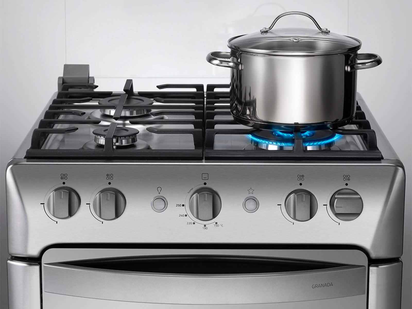 Cocina Granada Zafiro. Máxima potencia con quemador Triple Coronoa. Tecnología con revestimiento reallyclean. Sistema cortagas, de seguridad en el horno. Diseño con ampliación del área útil del tablero, parrillas de hierro fundido con resistencia de 70kg por parrilla. Horno con mayor capacidad, mayor visibilidad con luz frontal en el horno y puerta panorámica.