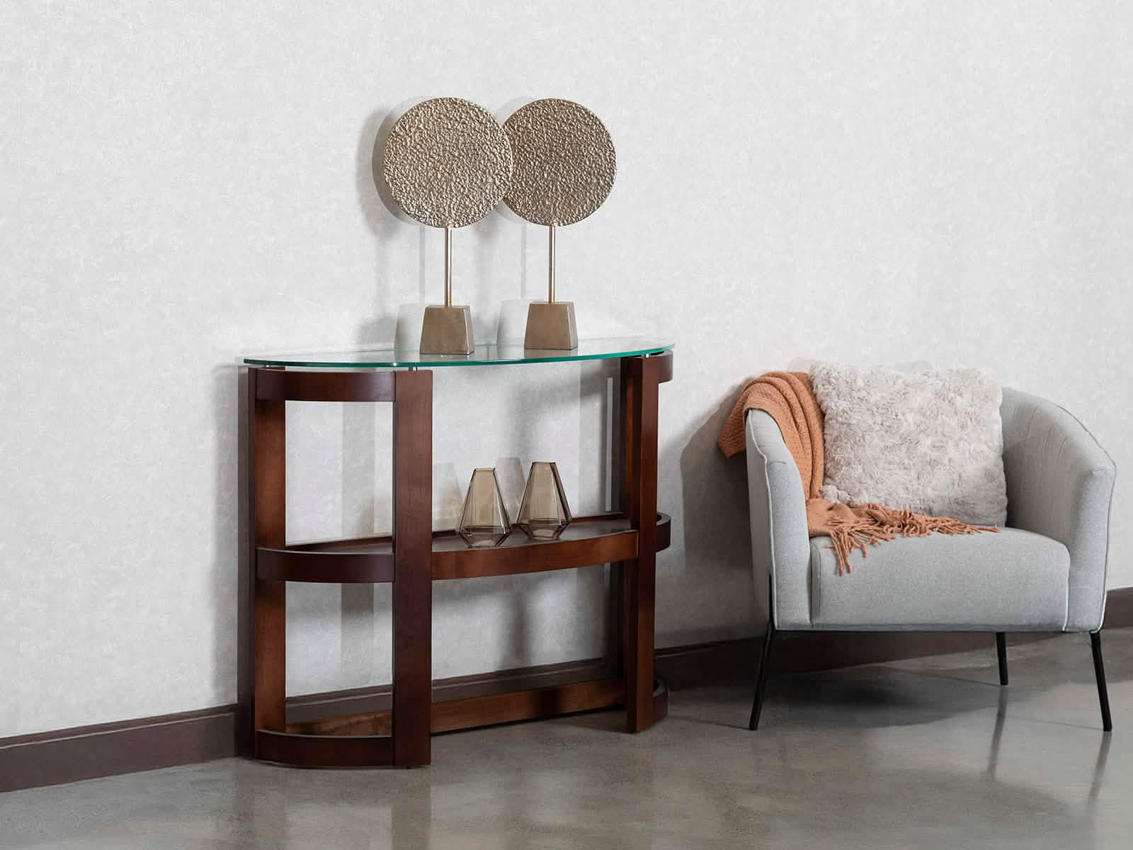 Nada mejor que la calidez que aporta la madera en combinación del vidrio. Es una consola que da estilo a tu hogar, perfecta para colocar en el recibidor o como separador de ambientes.