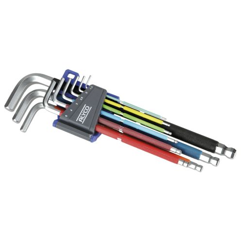 Juego de llaves acodadas hexagonales con punta hexagonal y punta de bola hexagonal. 9 piezas en soporte de plástico. Llaves enmangadas con colores diferentes. De 1,5 a 10 mm.