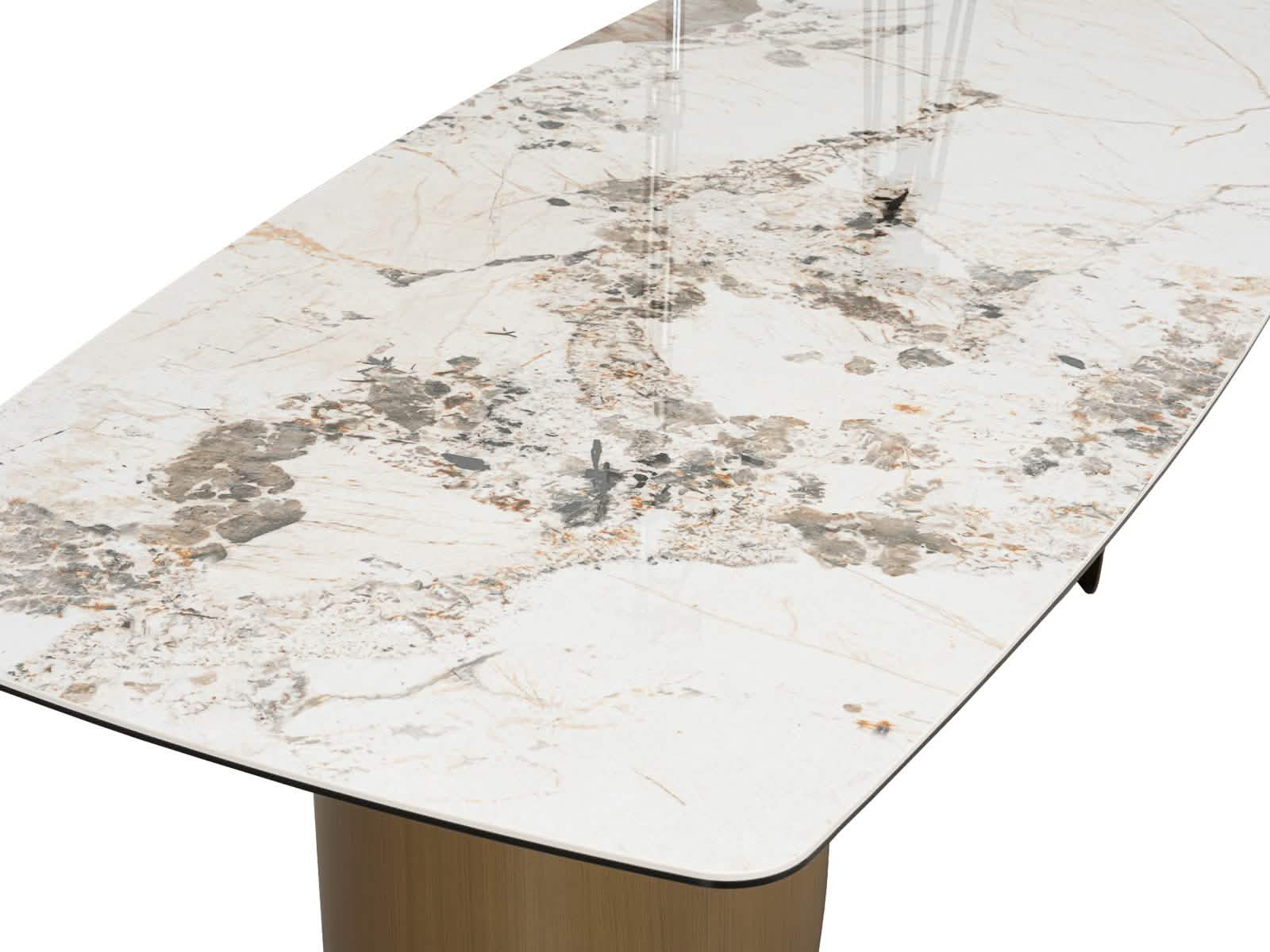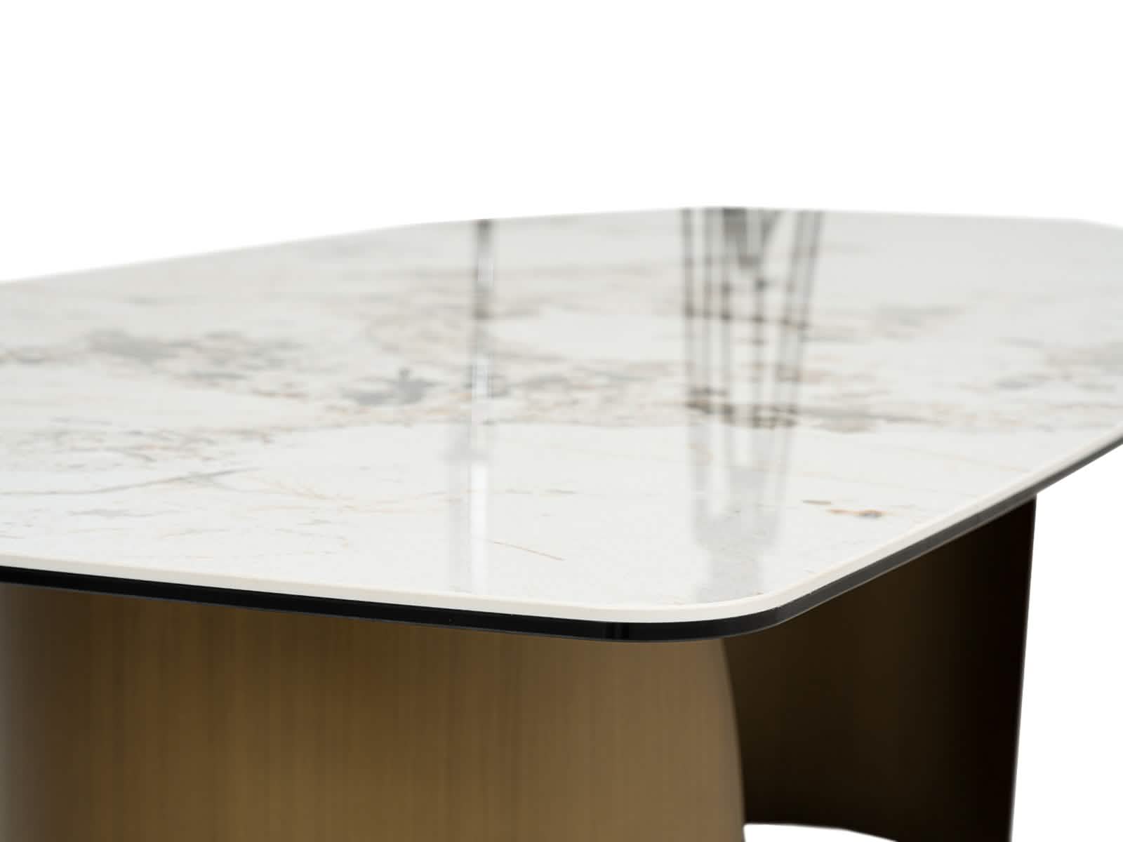 La Mesa Comedor Leo combina elegancia moderna con funcionalidad. Su top de piedra sinterizada resiste manchas, rayones y altas temperaturas, manteniendo su belleza por años. La estructura en bronce añade un toque sofisticado que complementa cualquier espacio.
