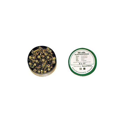 Los pistones o cartuchos Dynamit Nobel proporcionan la descarga necesaria para accionar el aturdidor de ganado, el cual está especialmente diseñado para dejar inconsciente a cerdos, lechones de 5 a 30 kg, becerros, ovejas hasta 1 año, entre otros, con la finalidad de sacrificarlos sin proporcionarles dolor ni sufrimiento. Este producto es principalmente utilizado por profesionales en mataderos y/o granjas. Los pistones de fogueo están compuestos por una vaina de latón, un cierre en forma de estrella de 9 puntas y en su interior una media de 1,25 granos de propelente. Estos cartuchos son compatibles para utilizarse en las pistolas de perno 9mm de las marcas Kerner, Blitz y Bólter. La presentación del empaque es un recipiente de plástico que contiene 50 unidades/piezas de pistones, calibre 9 mm x 17, con el sello distintivo en el fondo de color verde.