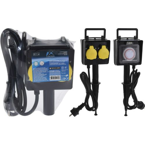 El distribuidor posee 2 enchufes, para conexiones que requieren potencias de 220 a 240 voltios, mientras que el programador tiene un temporizador analógico, que se utiliza para programar la iluminación y el riego en el jardín. Ambos artículos disponen de un cable en goma resistente que mide 1,5 metros c/u; así mismo, contienen un grado de protección de IP44 que los resguarda del polvo y salpicaduras. Sus medidas son: 8 cm de largo, 10 cm de ancho y 40 cm de alto.
