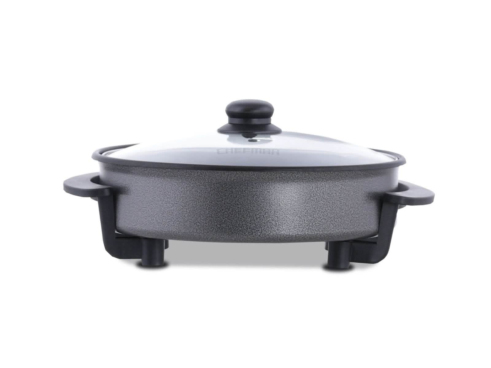 El Sartén Eléctrico Chefman de 12″ combina funcionalidad 3 en 1 con un diseño antiadherente para una cocción sin complicaciones. Ofrece control de temperatura ajustable y un elegante acabado en color negro, ideal para cualquier cocina.